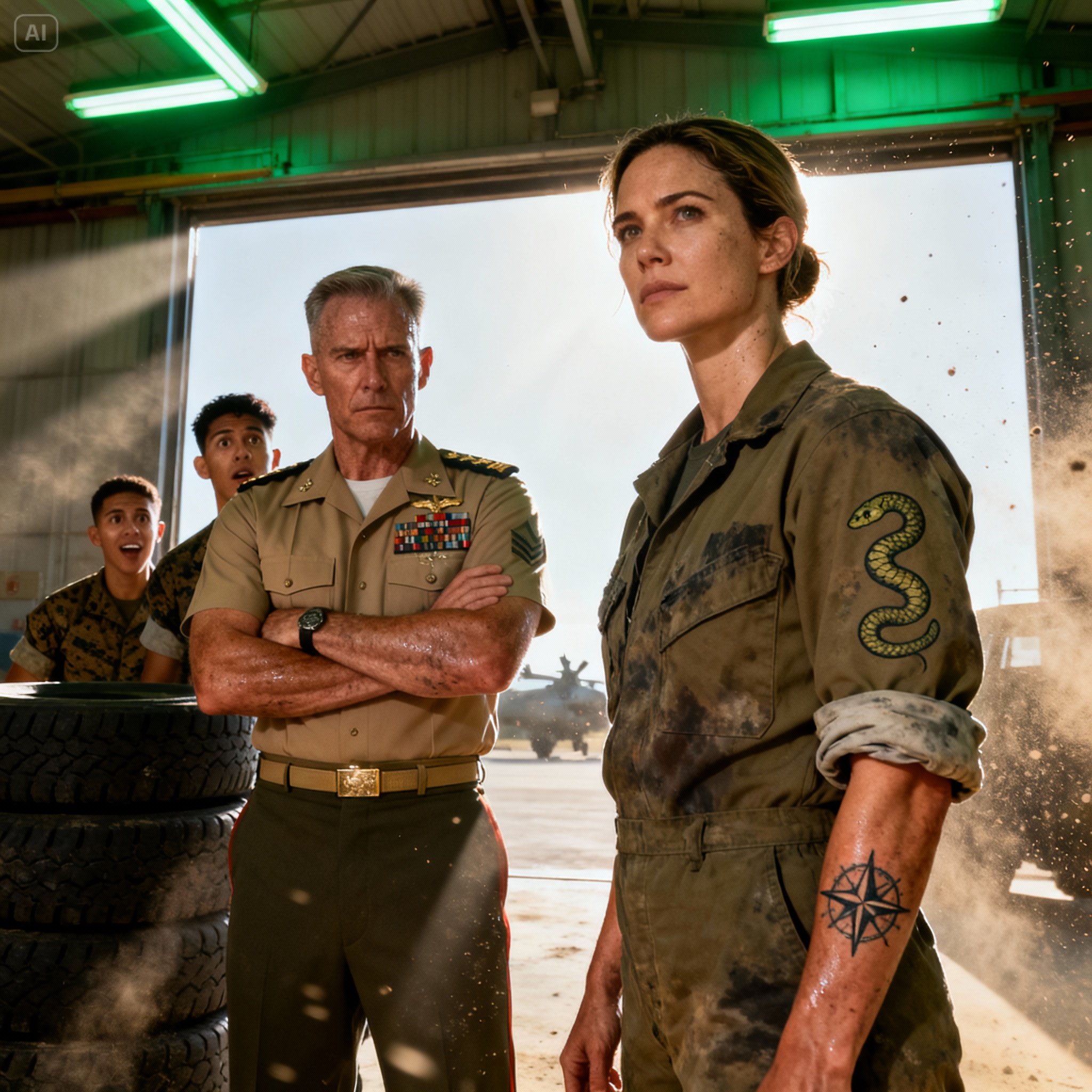 When he reached Monroe’s bay, the fragile tension broke. Mason, unable to resist the opportunity, leaned back against a workbench with a theatrical smirk. “Guest mechanics these days, sir,” he said, his voice just loud enough for the Colonel to hear, nodding pointedly at the tattoo on Monroe’s forearm. “They come with souvenirs.” He paused for effect. “You ink that yourself, Sergeant, or did the wrench slip?”