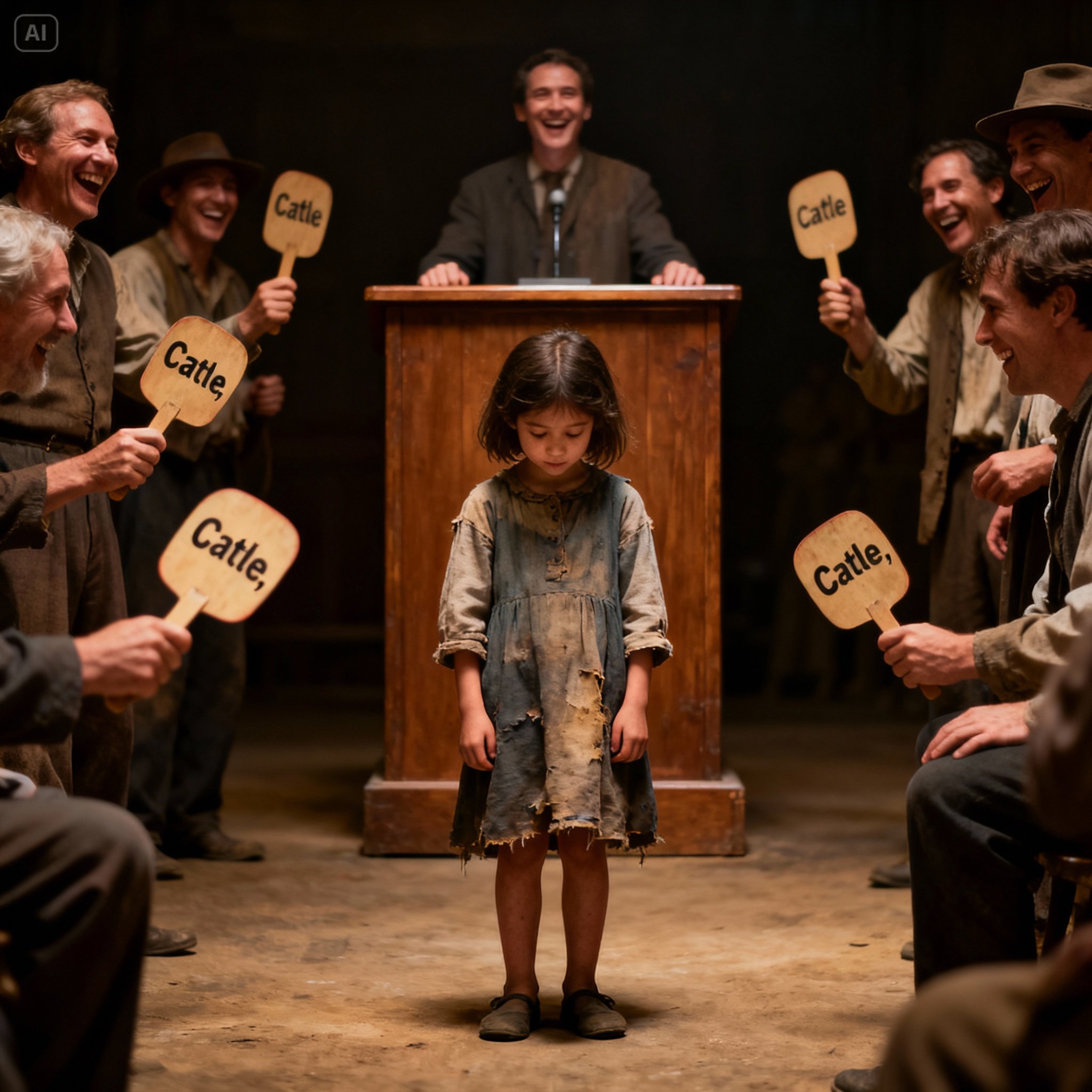 “An orphan girl, folks! Strong enough for chores, gentle enough to obey!”